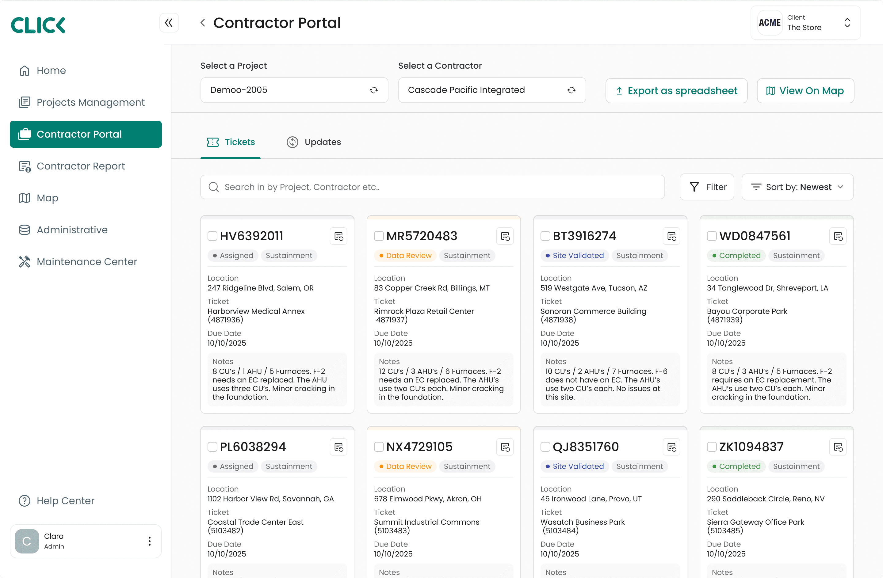 Select multiple tickets directly on the map and assign them to contractors in seconds. ClickPM automatically builds the fastest route between sites. Contractors see exactly where to go and what to do, no manual planning required.
