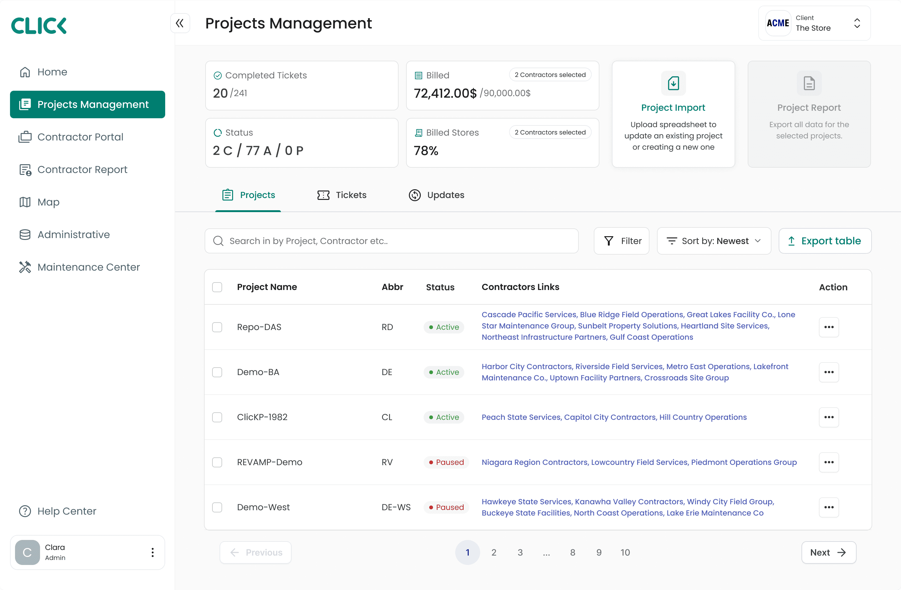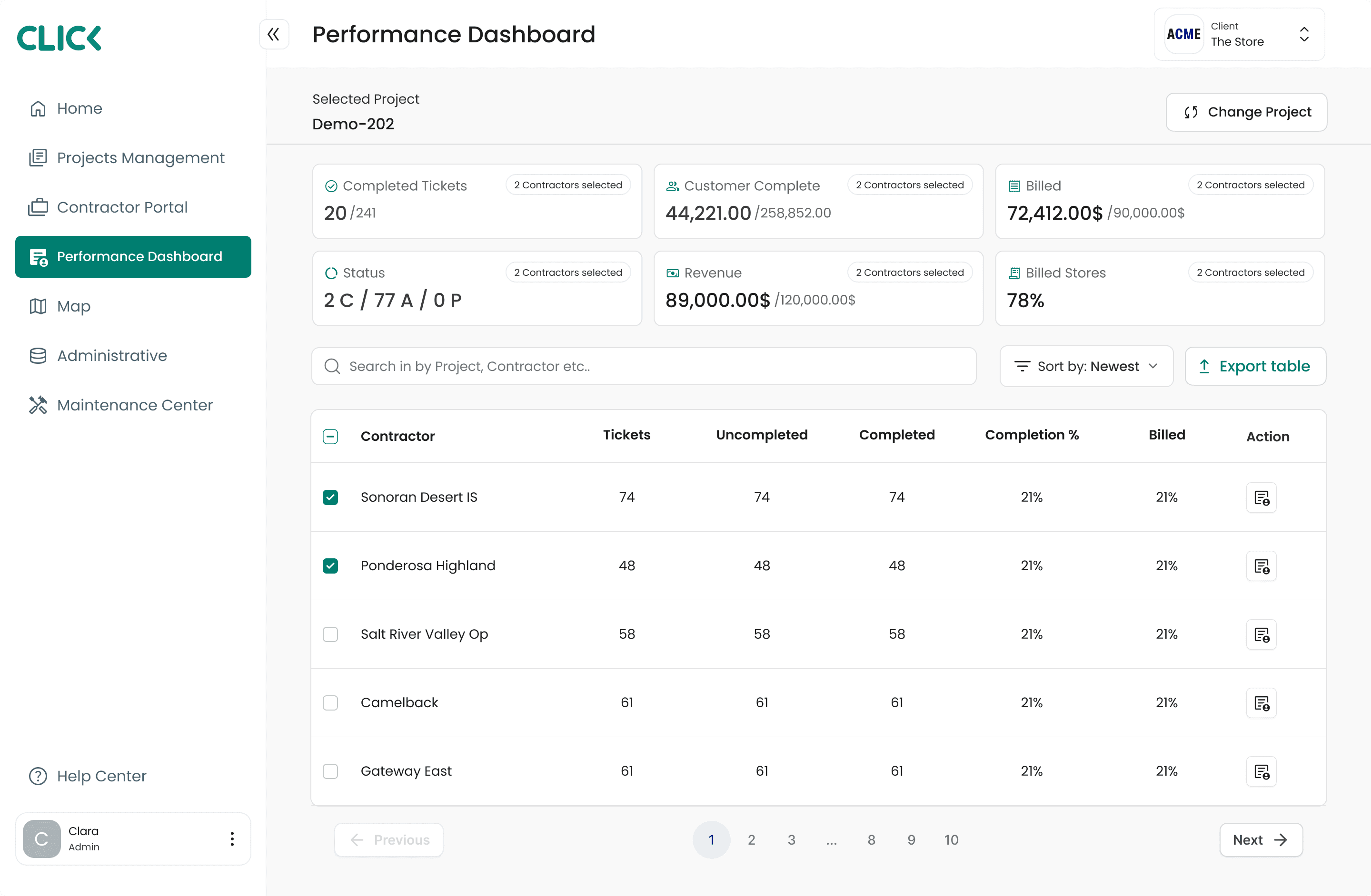 Track key metrics like completed tickets, revenue, fees, and billing status across every site. Filter by contractor or project to understand performance, monitor progress, and stay in control from start to finish.